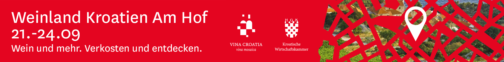 Za tu posebnu priliku, koju niti jedan ljubitelj vina nije trebao propustiti, oblikovali smo upečatljiv vizual koji je podjednako privlačan i informativan. U crveno – bijeloj kombinaciji boja, koje u svom nacionalnom identitetu dijele i Hrvatska i Austrija, prikazana je točna lokacija sajma na trgu Am Hof, dok se ispod mape nazire fotografija hrvatskog vinograda.